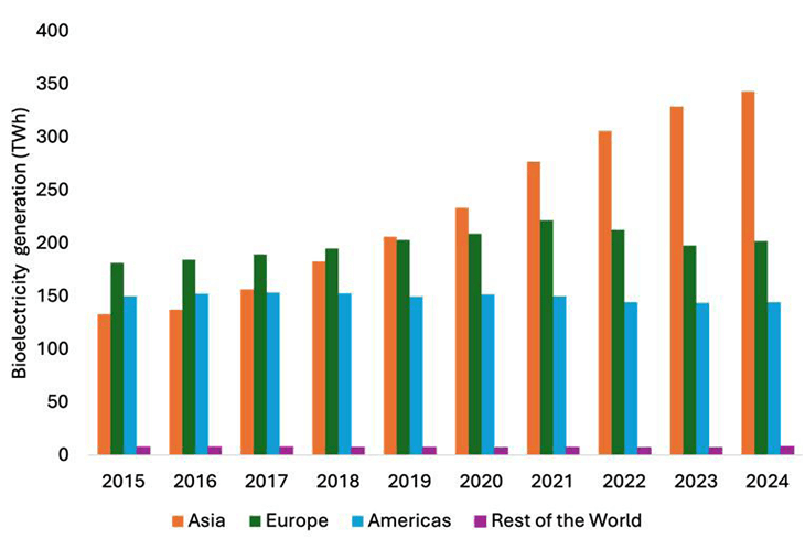 世界のバイオマス発電量は右肩上がりの成長を続けており、2024年の世界バイオマス発電量は前年比2.96%増の698TWh(テラワットアワー)となりました。