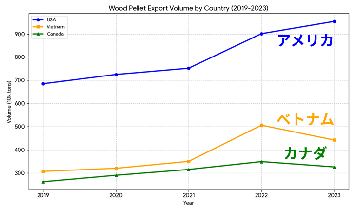 世界で木質ペレットの輸出量が多い国は、豊富な森林資源を持つ「アメリカ」「ベトナム」「カナダ」です。