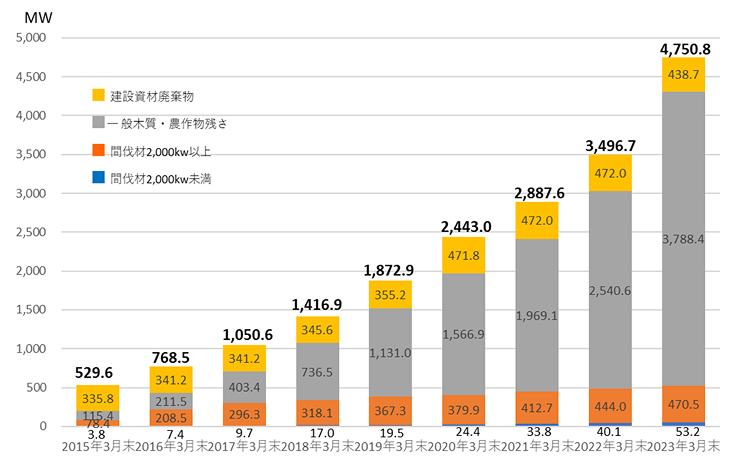 2015年から2023年の8年間で、木質バイオマス発電の稼働容量は約9倍に拡大しました。
